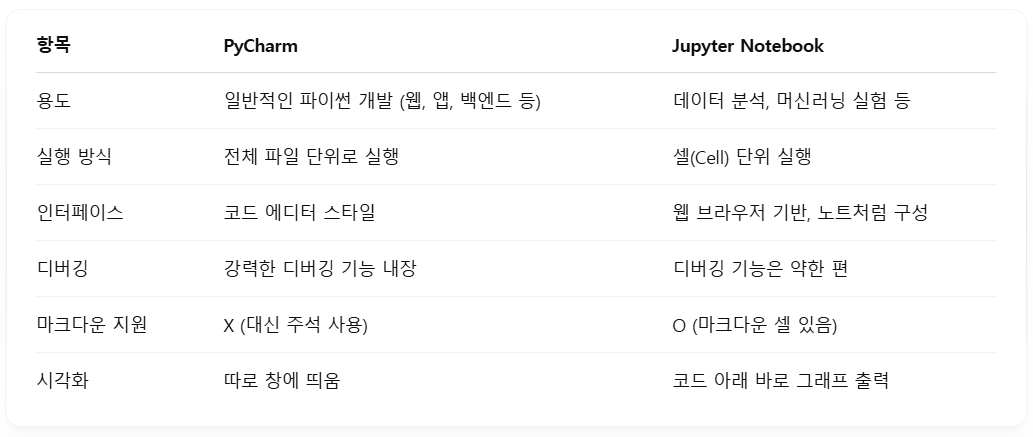 2) PyCharm은 JetBrains에서 만든 파이썬 전용 통합 개발 환경(IDE)임. 즉, 파이썬 코딩을 더 편하게, 효율적으로 해주는 프로그램. 본격적인 개발용으로 파일 관리, 구조, 디버깅 등을 체계적으로 하고 싶을 때 씀