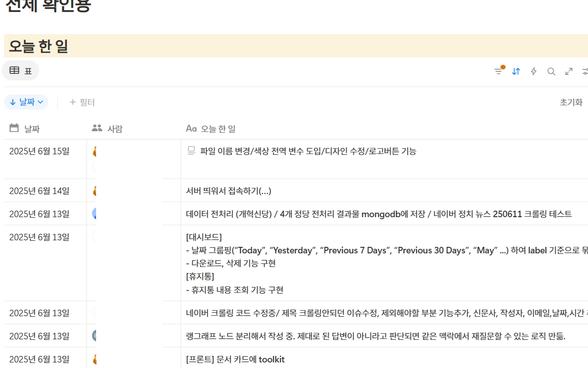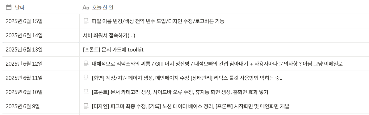 이번 주도 겁나 빠르게 지나갔다,... 그래도 학습일지 쓰기 쉬워진게 우리 조는 매일 퇴근시간 30분전부터 그 날 한 거 정리하고 서로 뭐했는지 발표(?)시간을 가져서 노션에 이렇게 다 기록되어있음 이 깔쌈한 로그는 내가 만들었음 당연히 ㅎ 나 왤케 능력자 ??